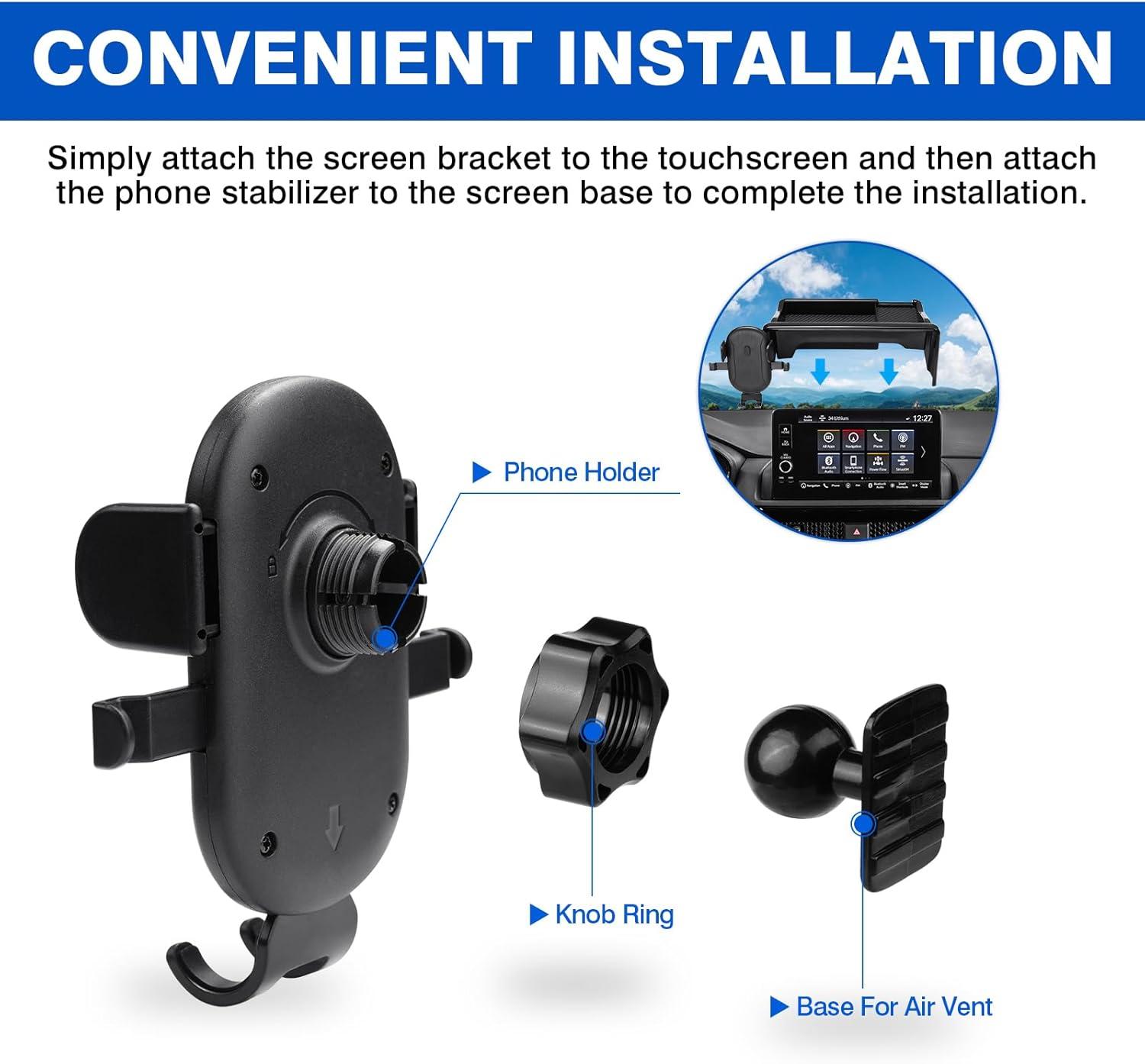 Upgraded New Design—Different with normal car phone mount.Our phone mount comes with one holder and two bases.One base is installed on touchscreen directly,will not effect the function of the air vent and more stable.Another base is installed on air vent.You can choose one which you like to use.