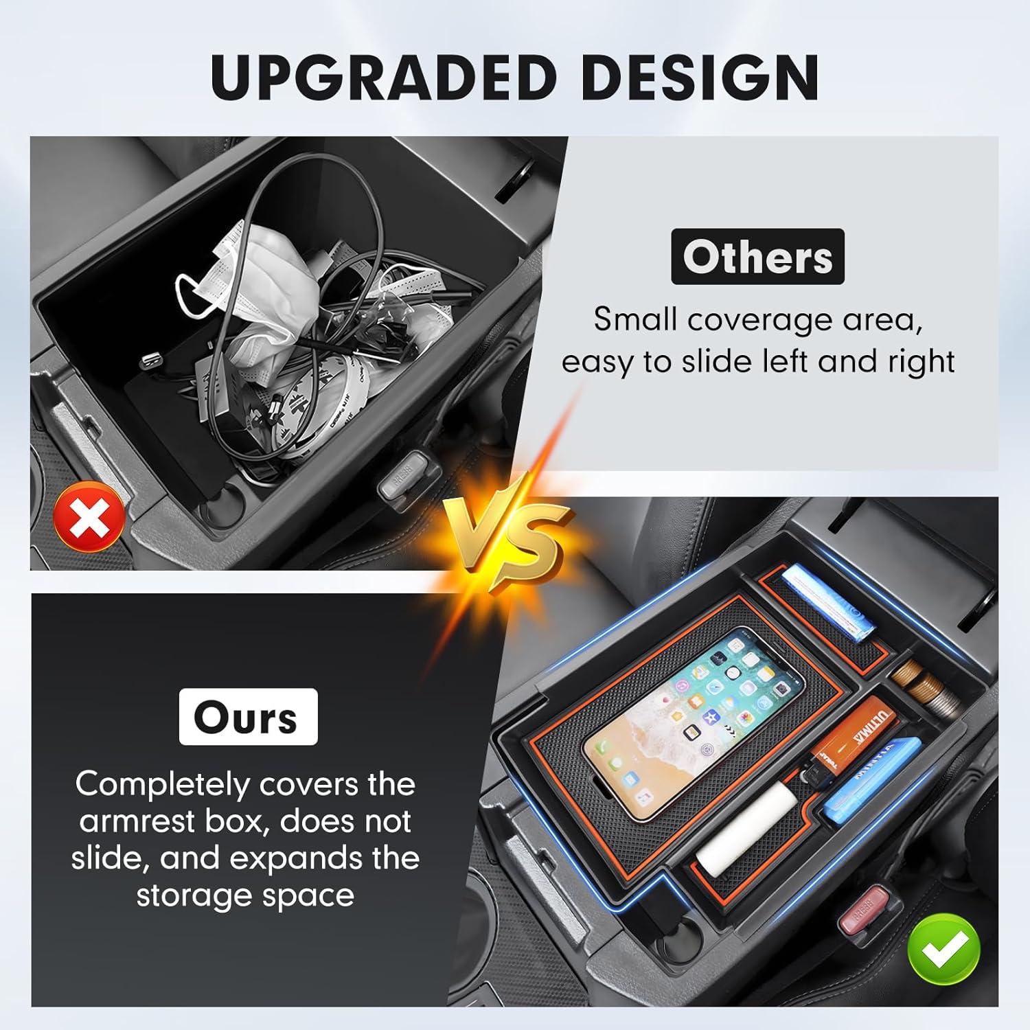 Well-made Organizer: It is made of a durable and sturdy ABS shell. The even edge and smooth surface give the armrest storage box an OEM part appearance. Additionally, the provided tasteless and non-toxic rubber liner effectively prevents items from sliding and rattling.