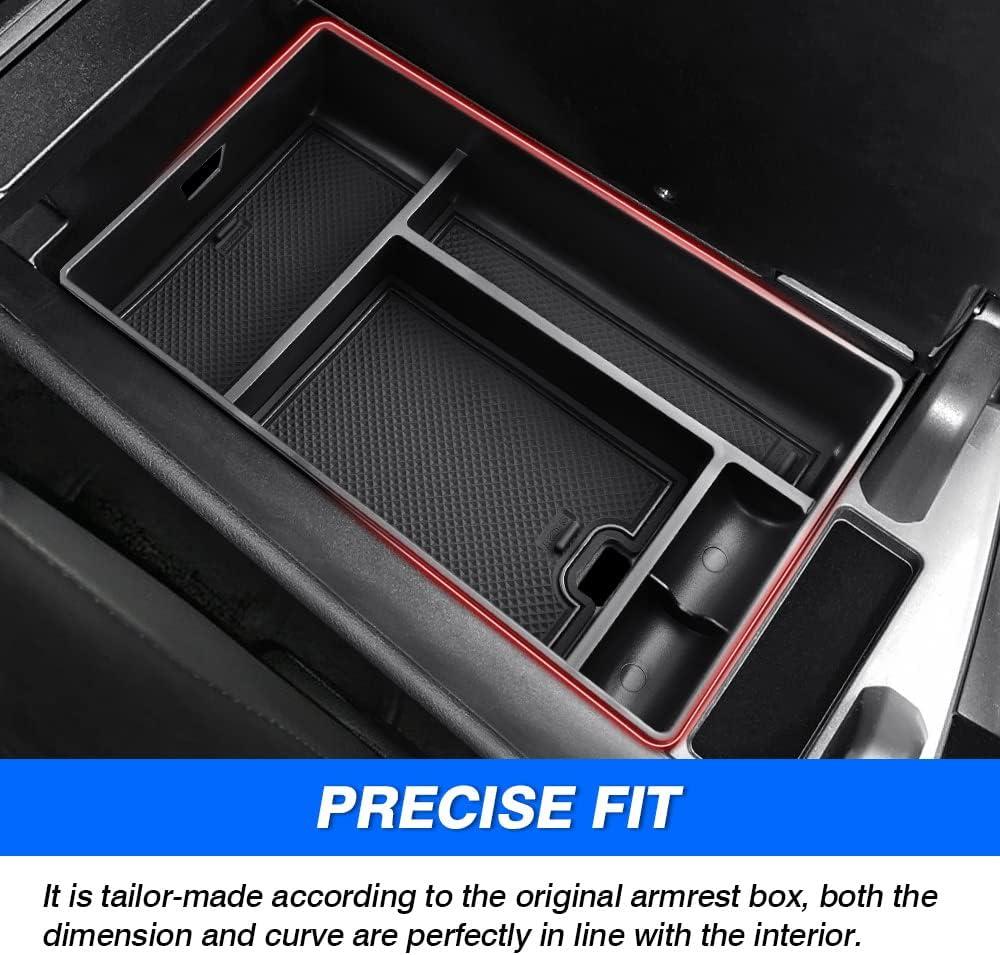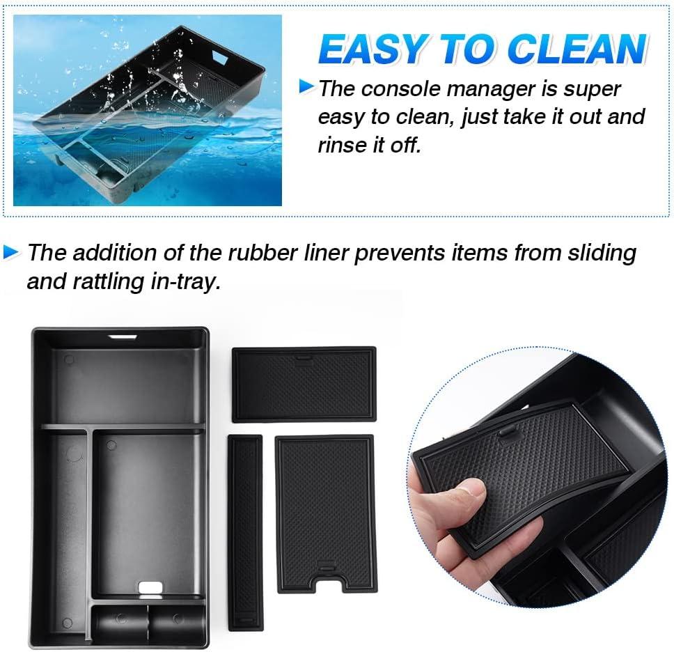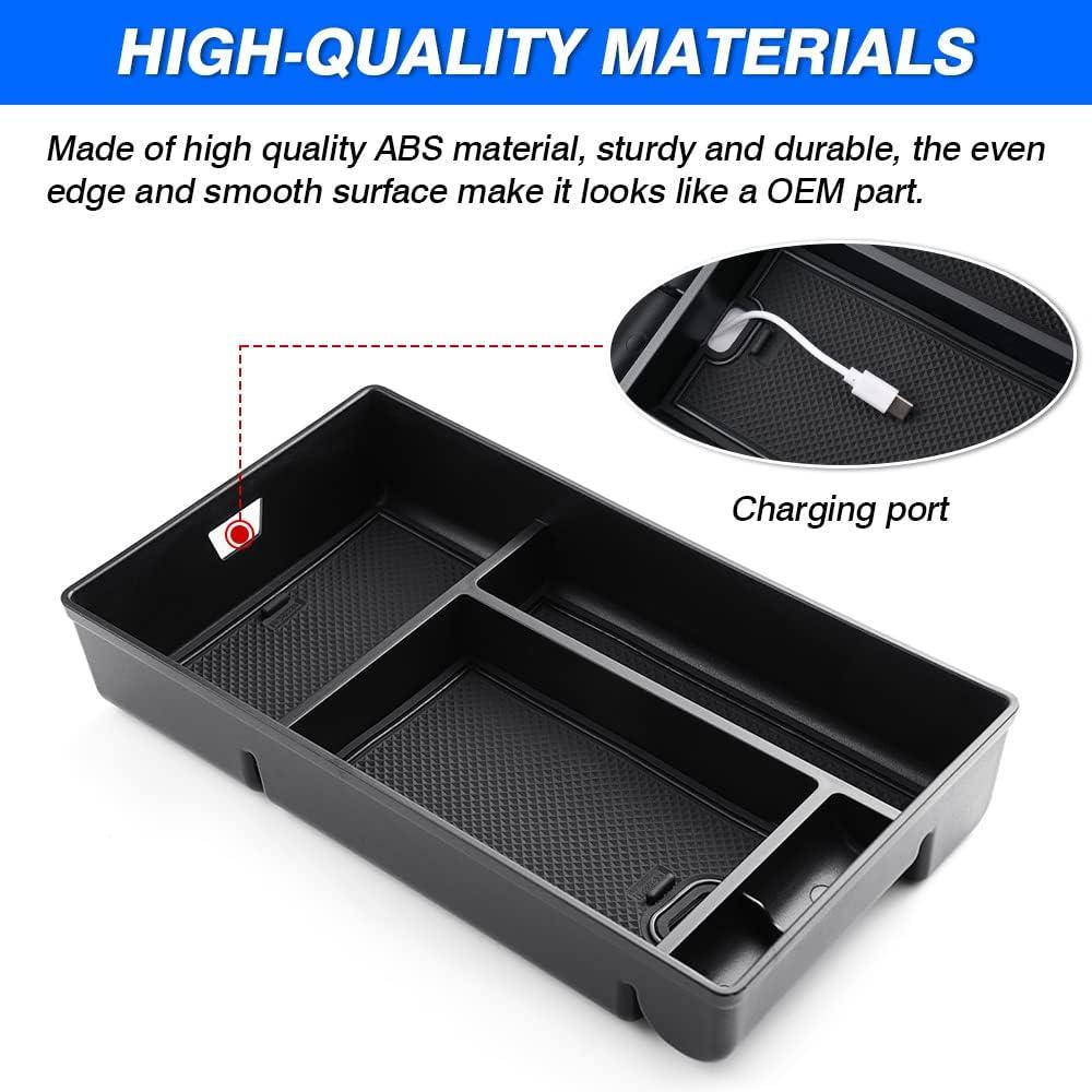 Well-made Organizer: It is made of a durable and sturdy ABS shell. The even edge and smooth surface give the armrest storage box an OEM part appearance. Additionally, the provided tasteless and non-toxic rubber liner effectively prevents items from sliding and rattling.