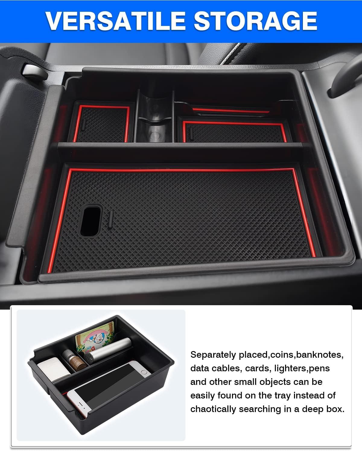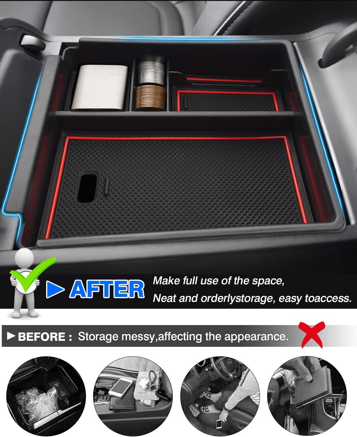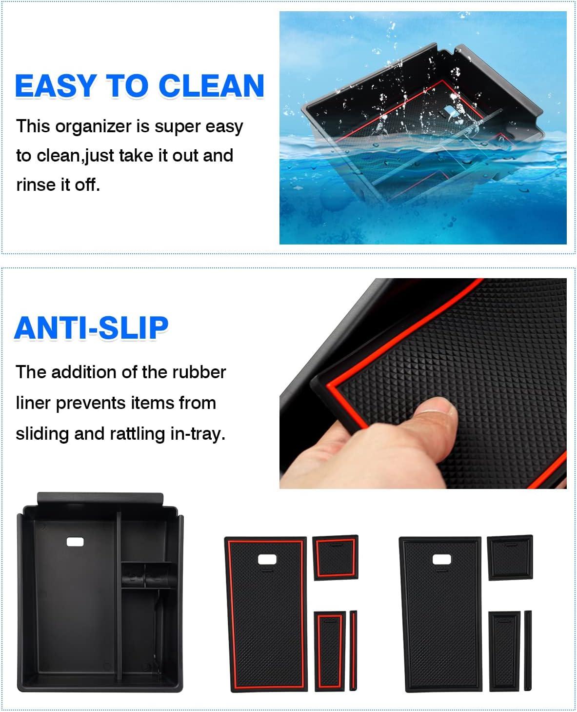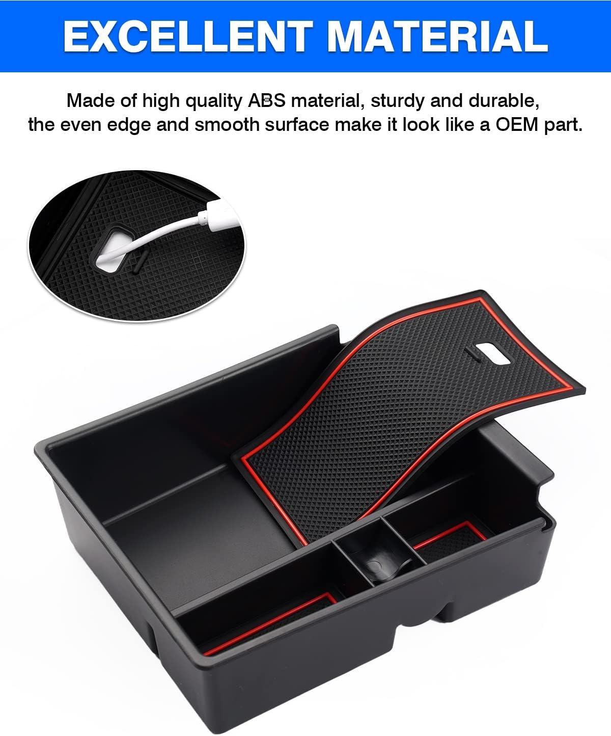 【Well-made Organizer】It is made of a durable and sturdy ABS shell. The even edge and smooth surface give the armrest storage box an OEM part appearance. Additionally, the provided tasteless and non-toxic rubber liner effectively prevents items from sliding and rattling.