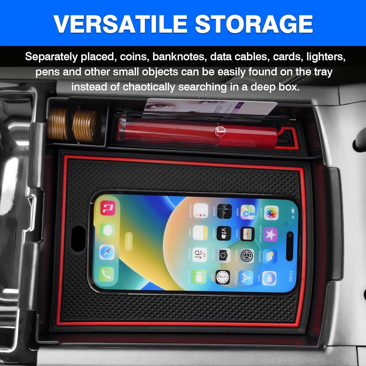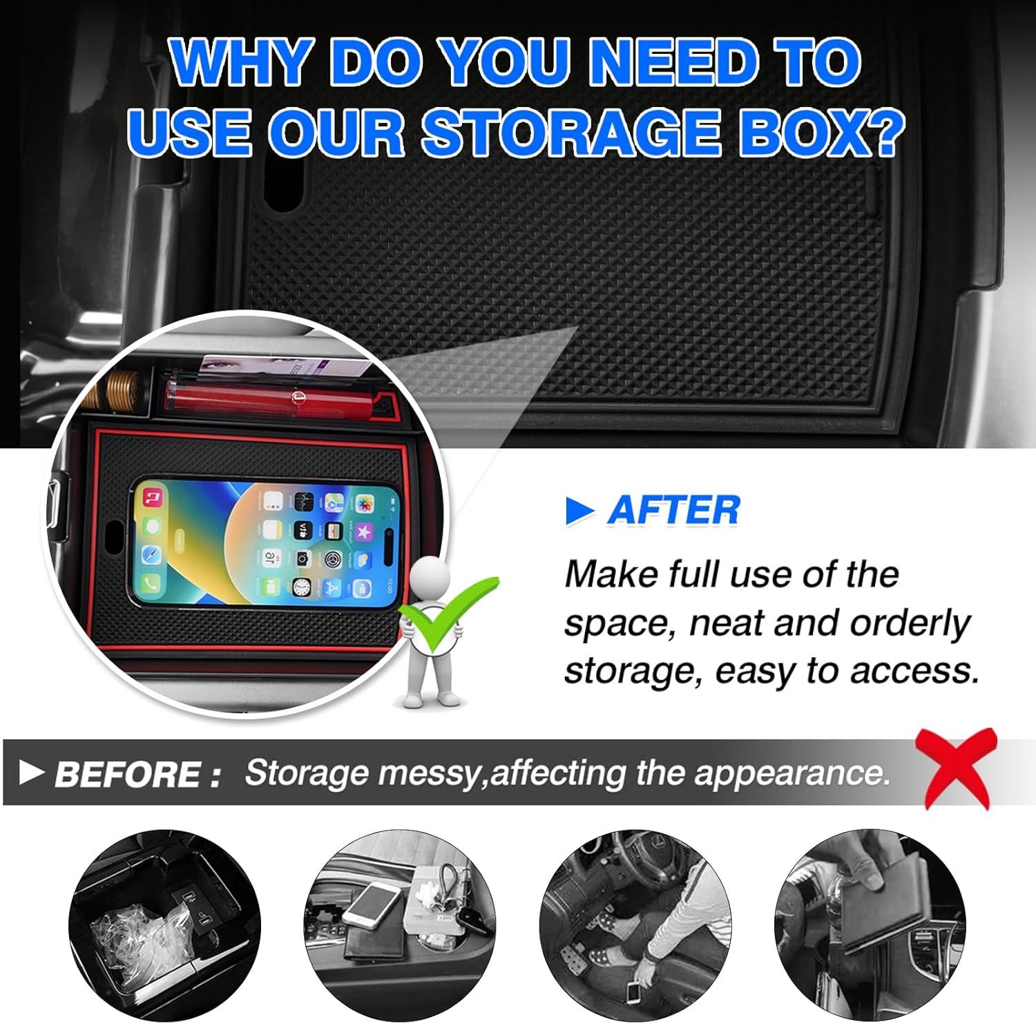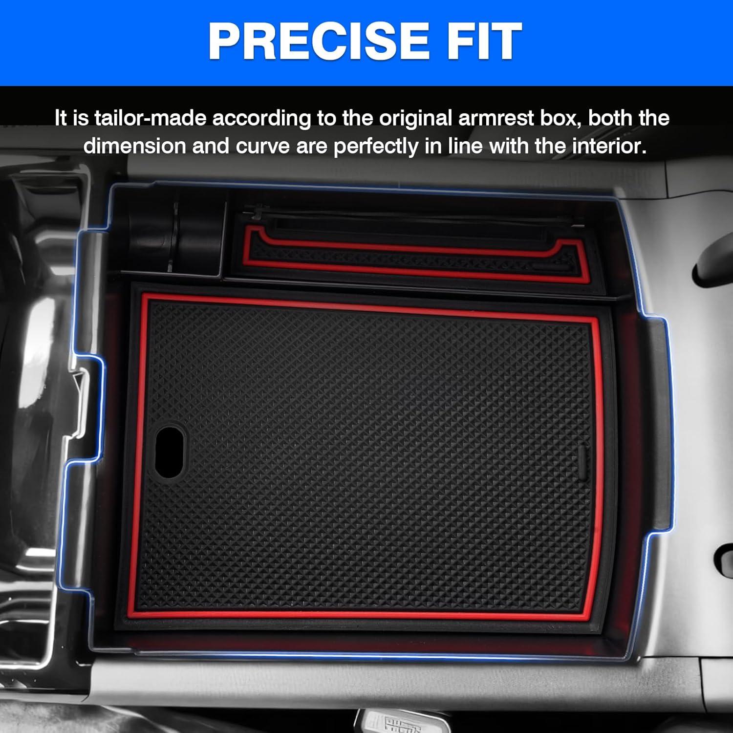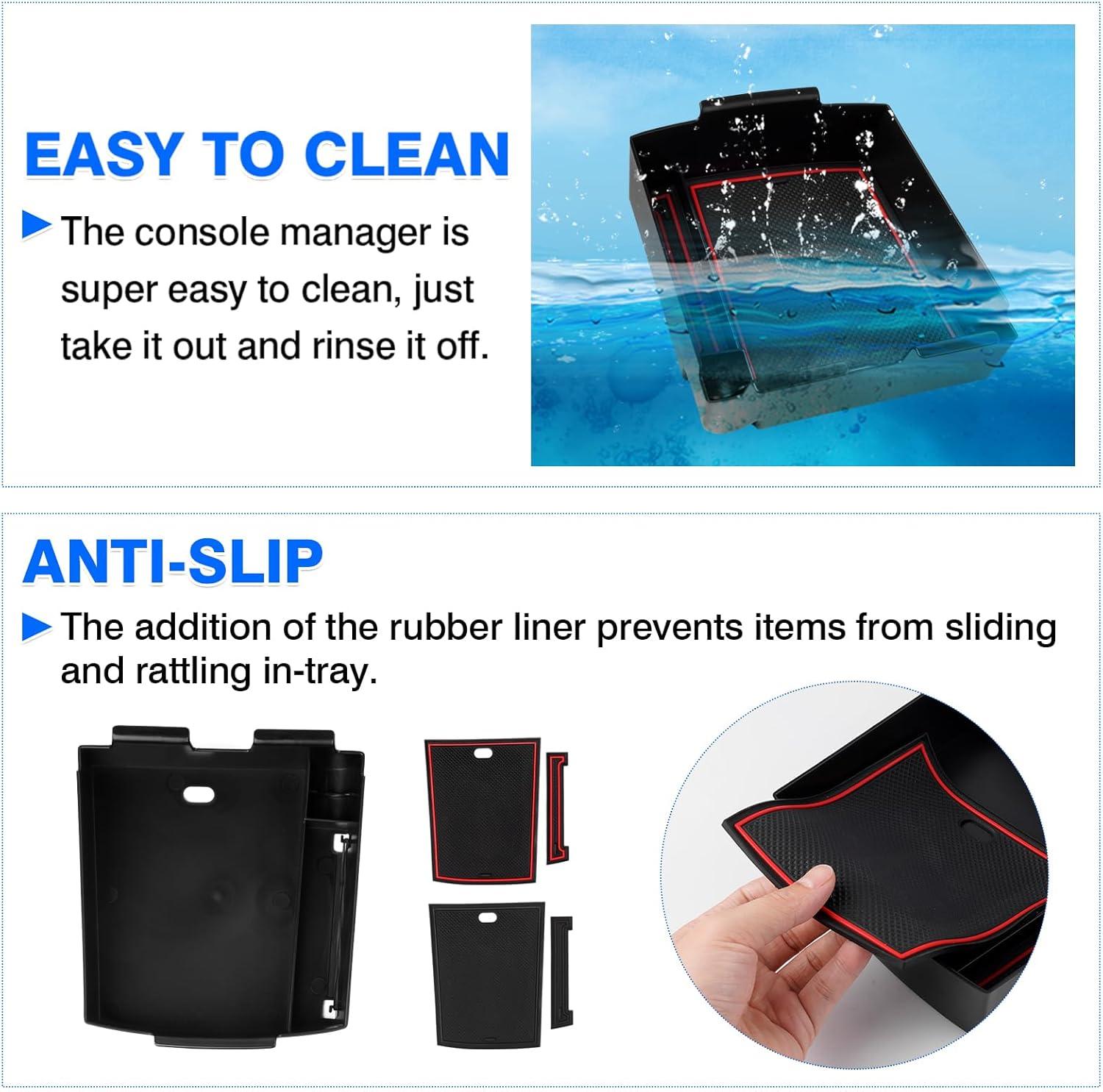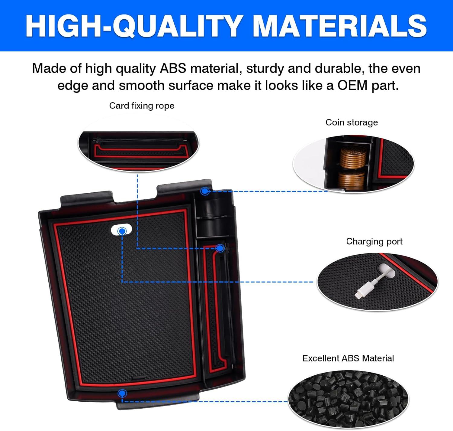 【Well-made Organizer】It is made of a durable and sturdy ABS shell. The even edge and smooth surface give the armrest storage box an OEM part appearance. Additionally, the provided tasteless and non-toxic rubber liner effectively prevents items from sliding and rattling.