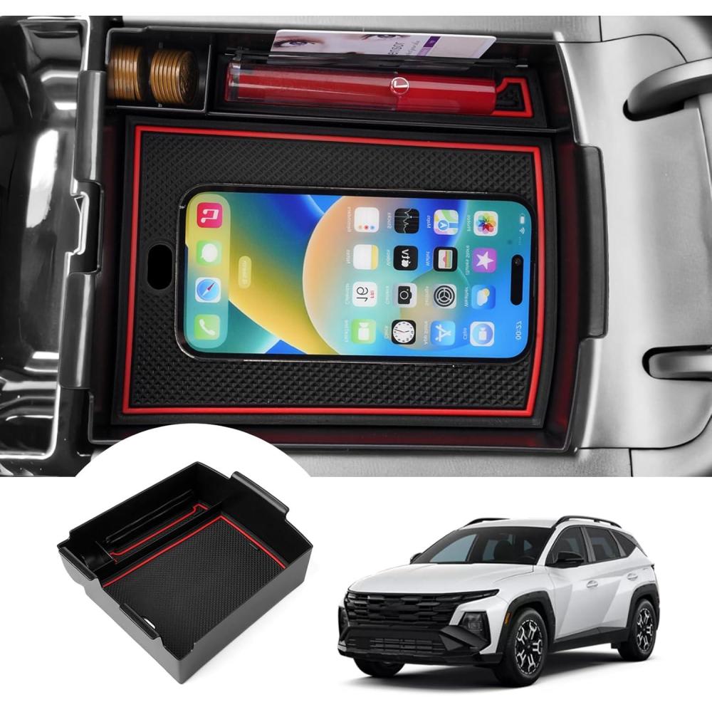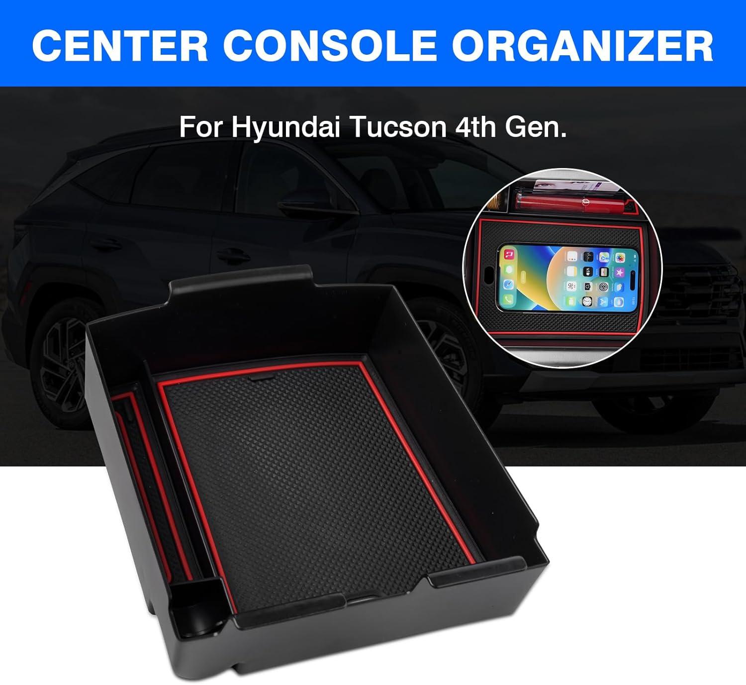 Autorder Center Console Organizer for 2022-2026 Hyundai Santa Cruz Accessories Car Armrest Storage Box Middle Console Tray Container with Black & Red Non-Slip Silicone Mats(2025 Tucson)