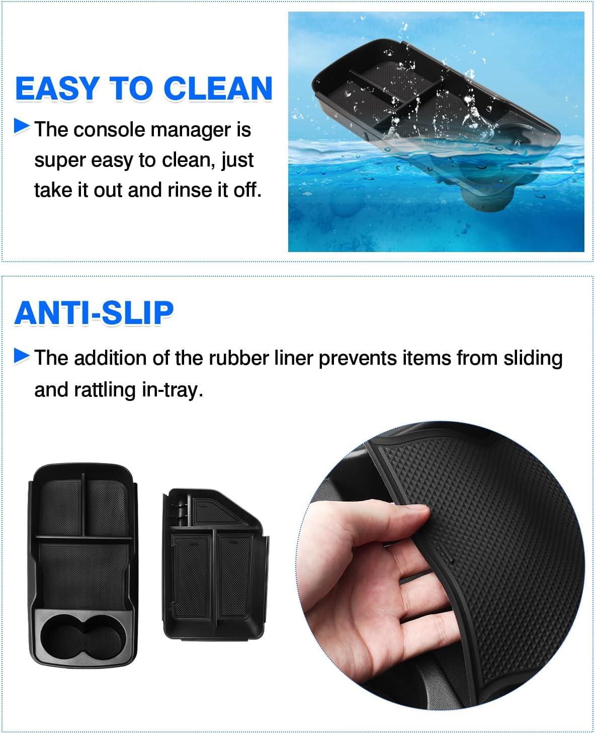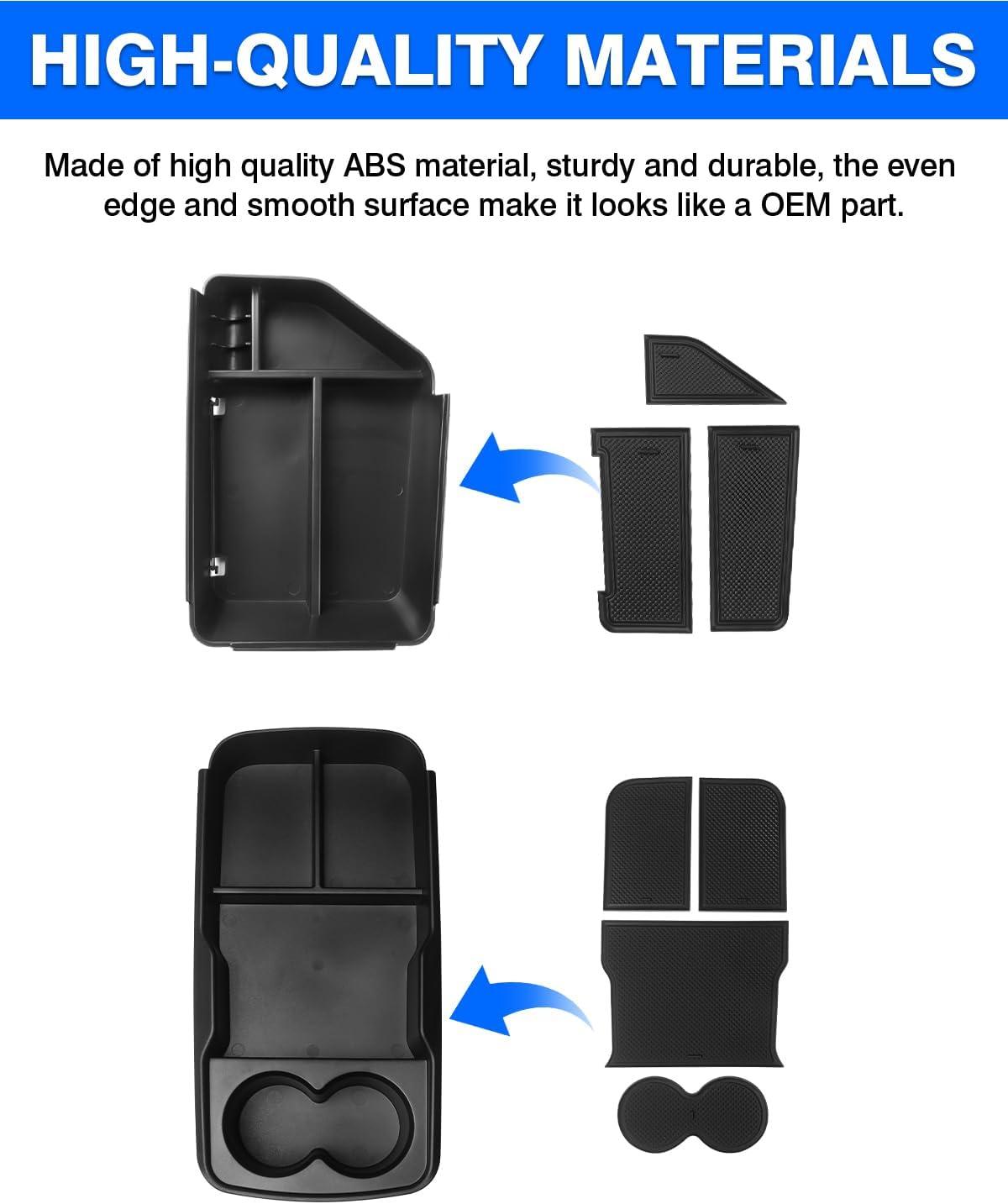 Well-made Organizer: It is made of a durable and sturdy ABS shell. The even edge and smooth surface give the middle console organizer an OEM part appearance. Additionally, the provided tasteless and non-toxic rubber liner effectively prevents items from sliding and rattling.