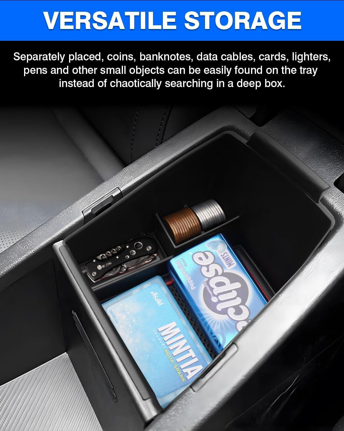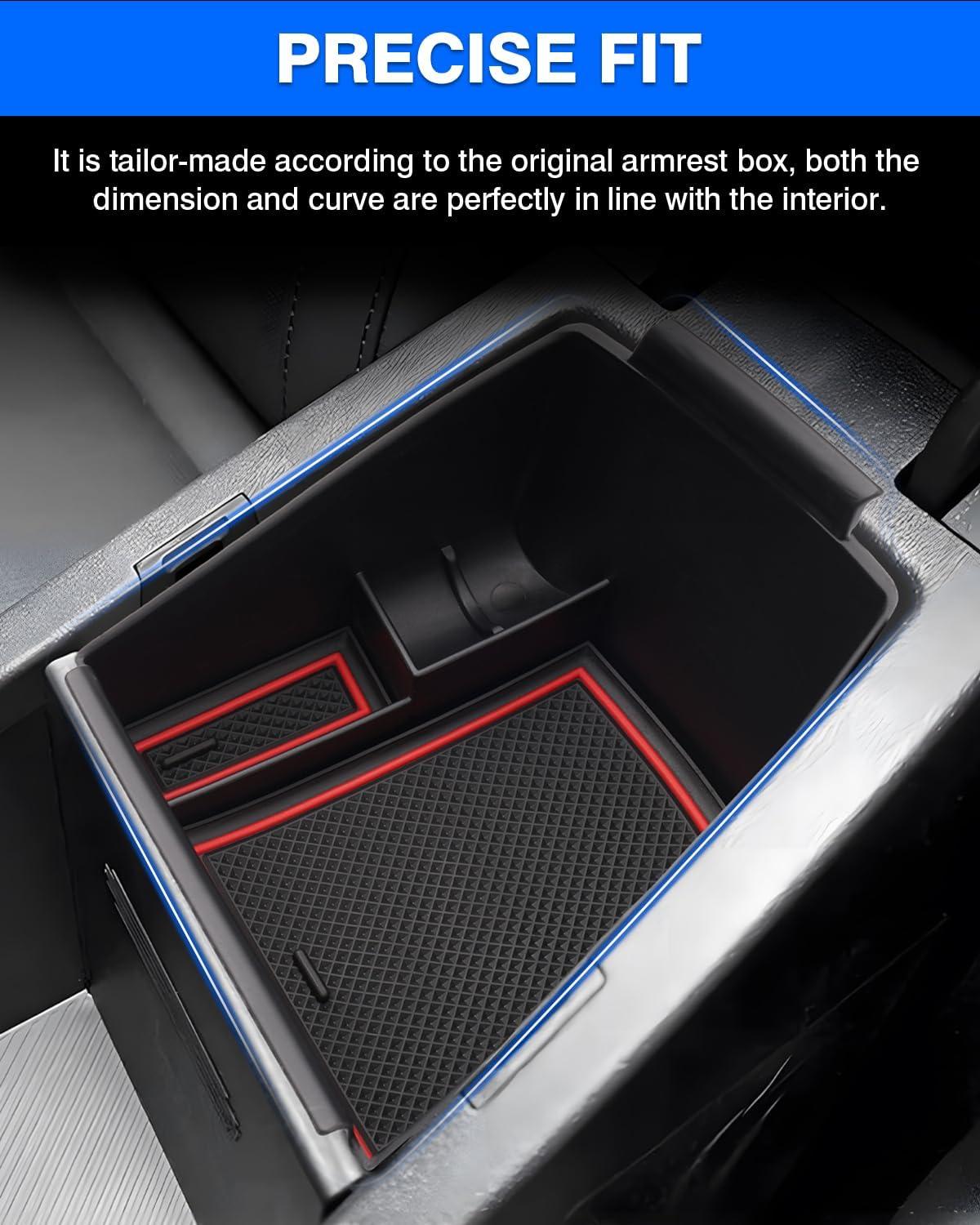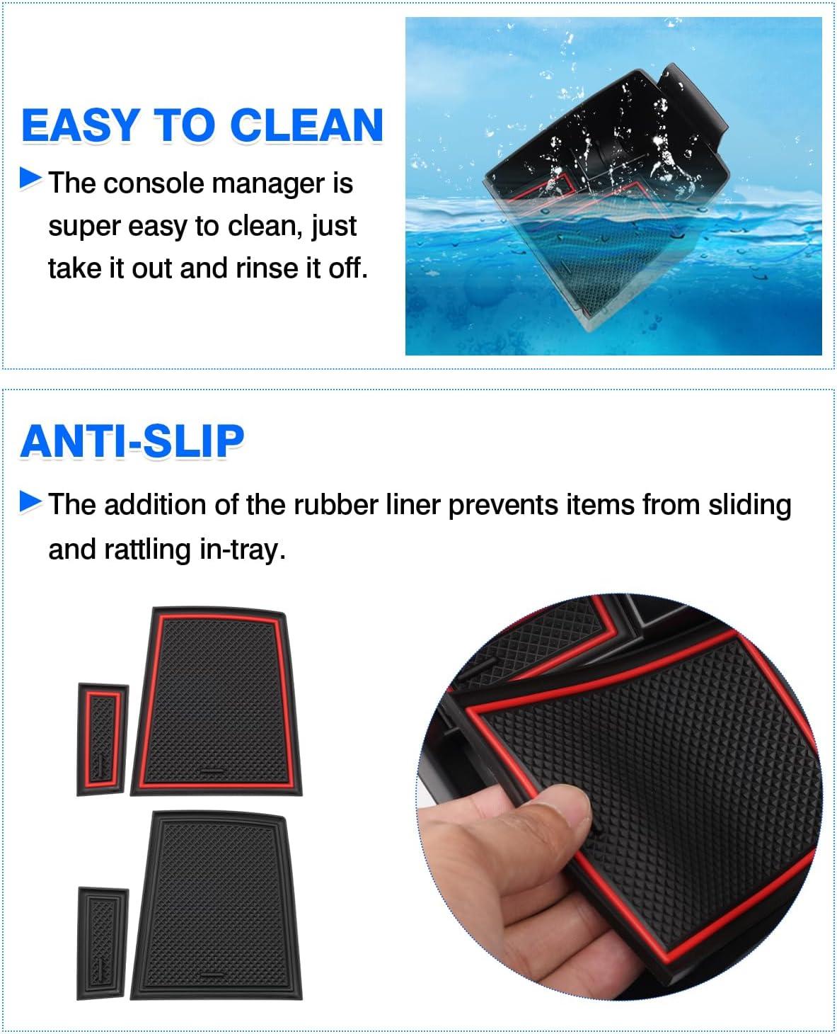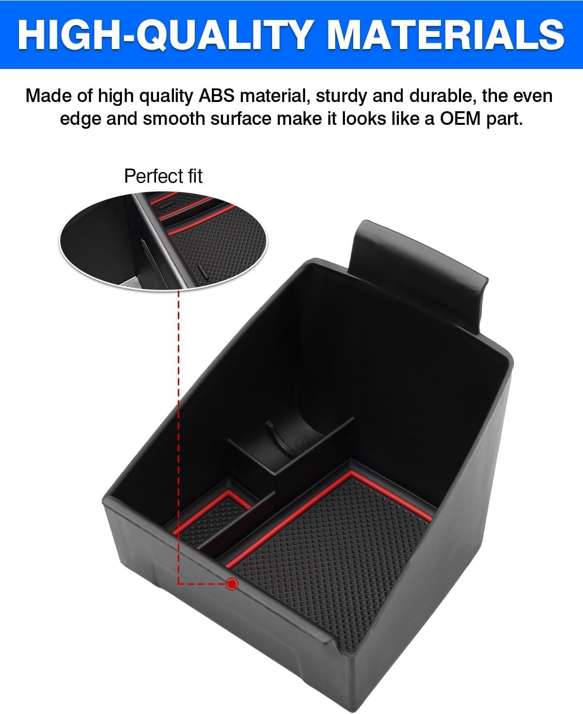 Well-made Organizer: It is made of a durable and sturdy ABS shell. The even edge and smooth surface give the middle console organizer an OEM part appearance. Additionally, the provided tasteless and non-toxic rubber liner effectively prevents items from sliding and rattling.