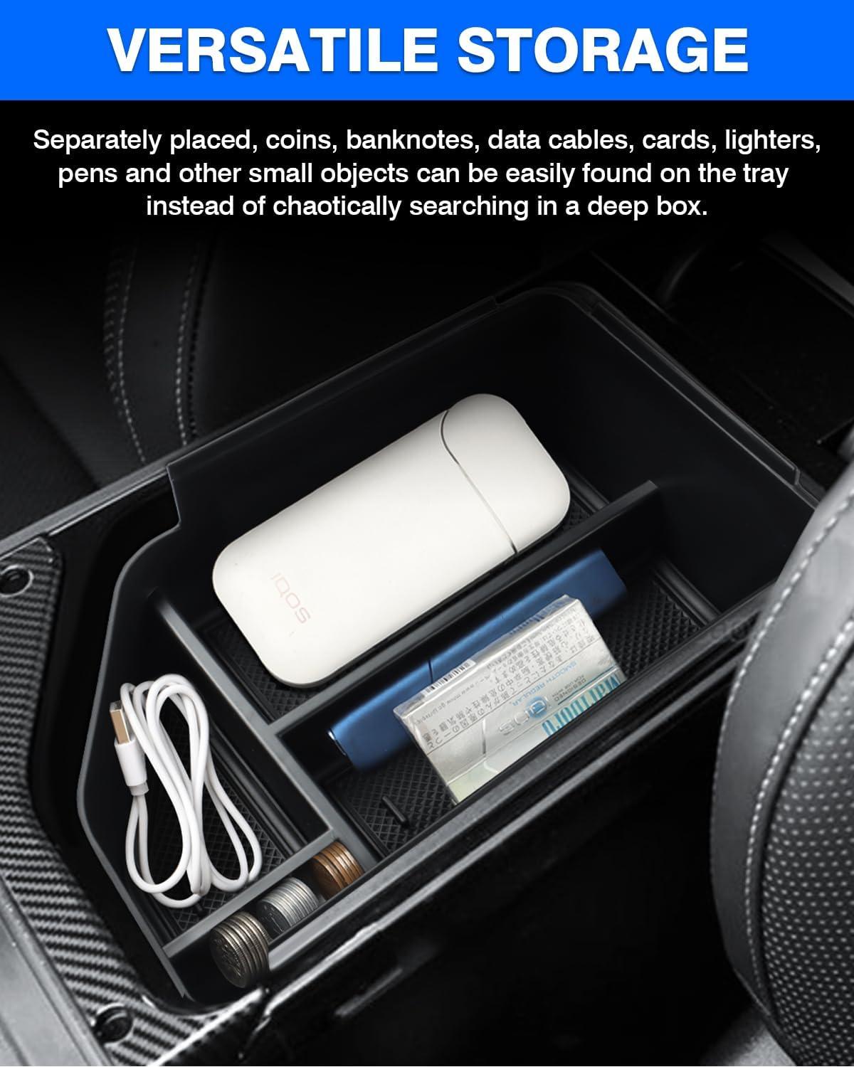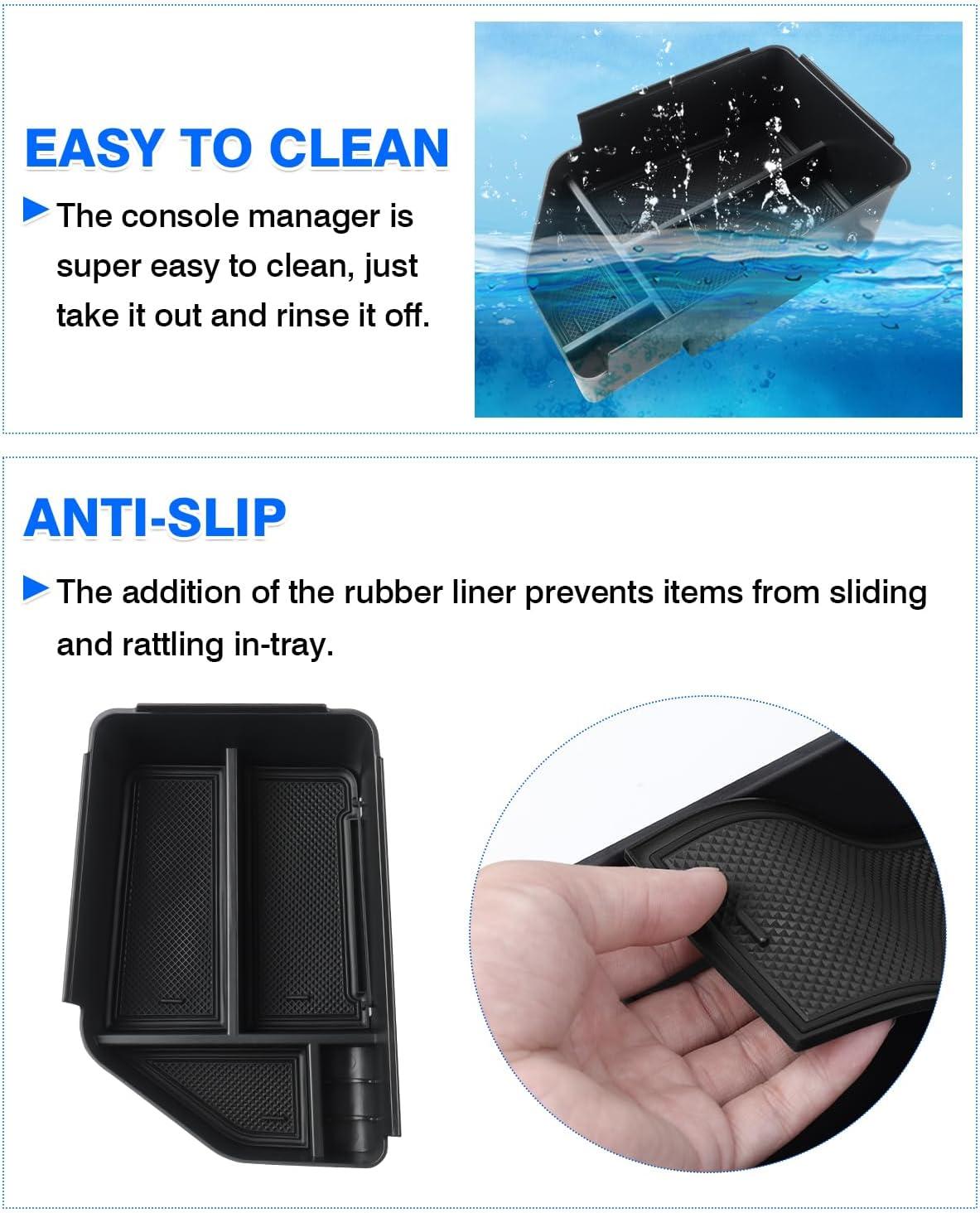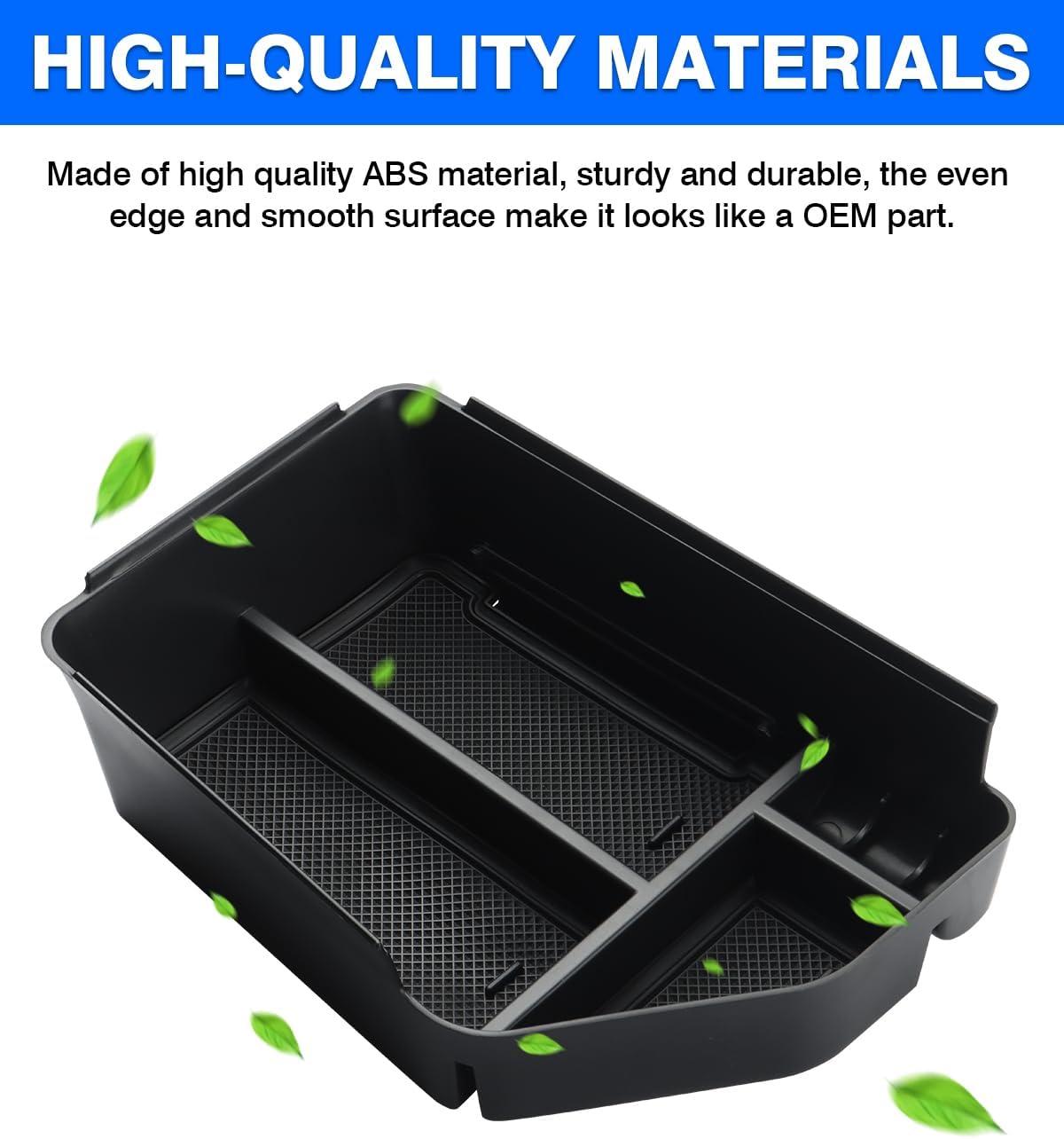 Well-made Organizer: It is made of a durable and sturdy ABS shell. The even edge and smooth surface give the middle console organizer an OEM part appearance. Additionally, the provided tasteless and non-toxic rubber liner effectively prevents items from sliding and rattling.