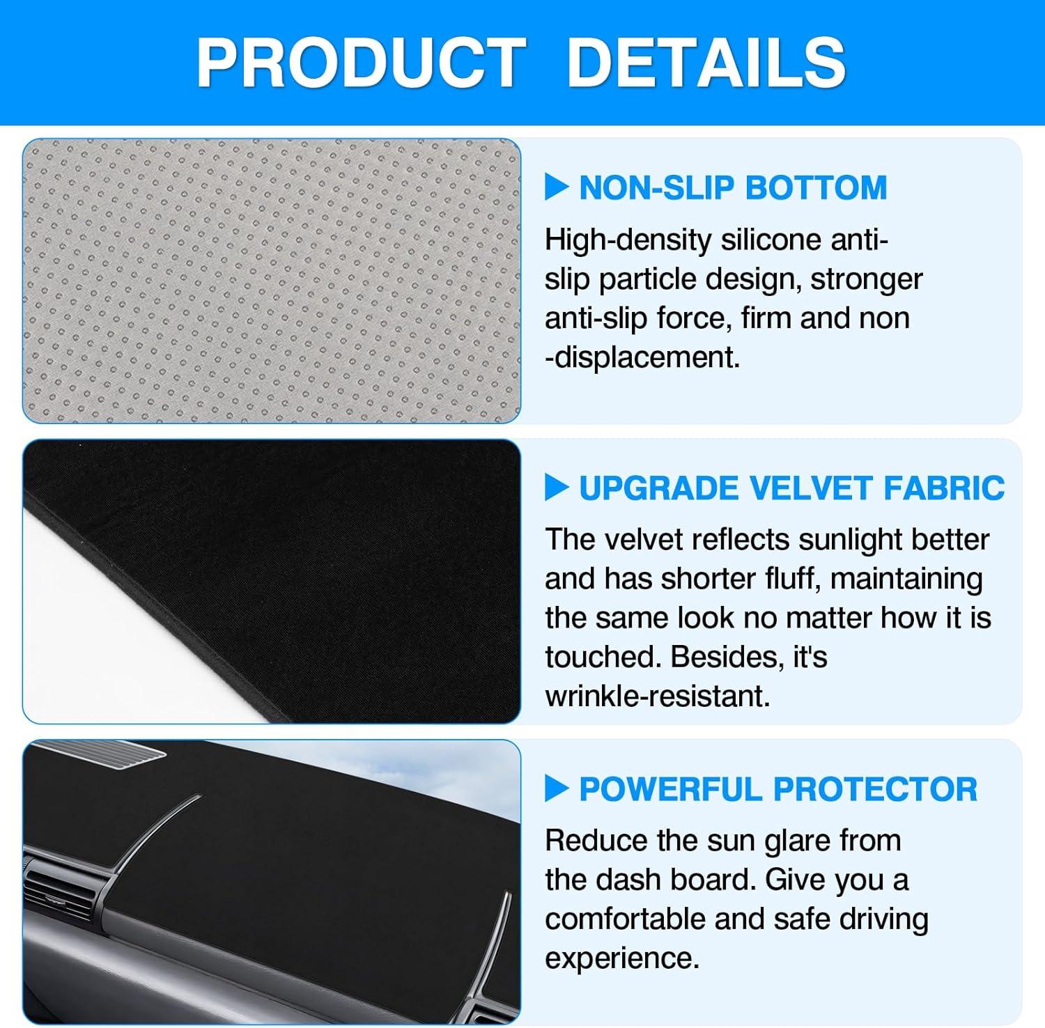 Premium Flannel: Our dash mat is made of high-quality flannel fabric, which is light and soft and resistant to distorting, fading, and wrinkles. The thick black fluff layer winter effectively absorbs heat, keeping the dash cooler in the summer and warmer in the