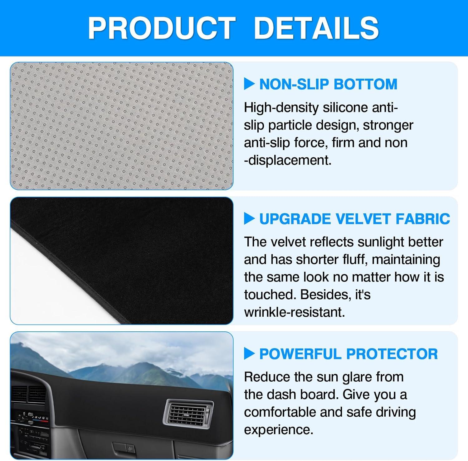 Premium Flannel: Our dash mat is made of high-quality flannel fabric, which is light and soft and resistant to distorting, fading, and wrinkles. The thick black fluff layer effectively absorbs heat, keeping the dash cooler in the summer and warmer in the winter.