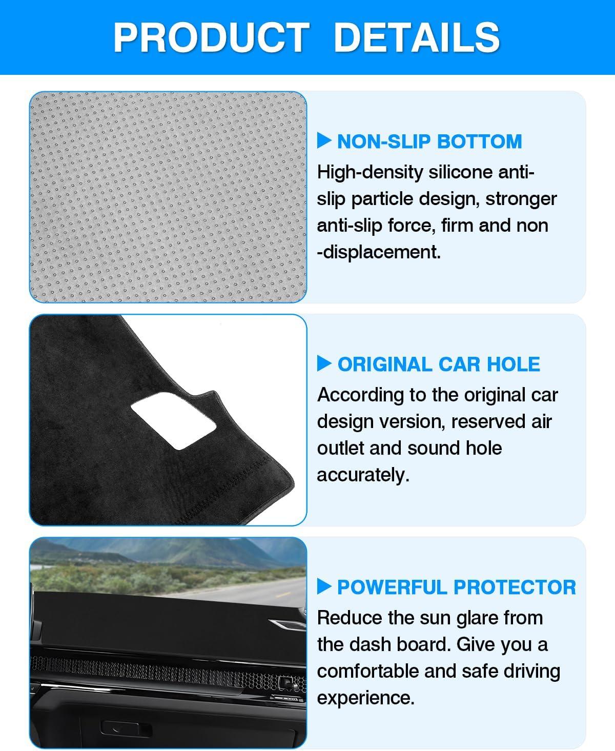 Premium Flannel: Our dash mat is made of high-quality flannel fabric, which is light and soft and resistant to distorting, fading, and wrinkles. The thick black fluff layer winter effectively absorbs heat, keeping the dash cooler in the summer and warmer in the winter