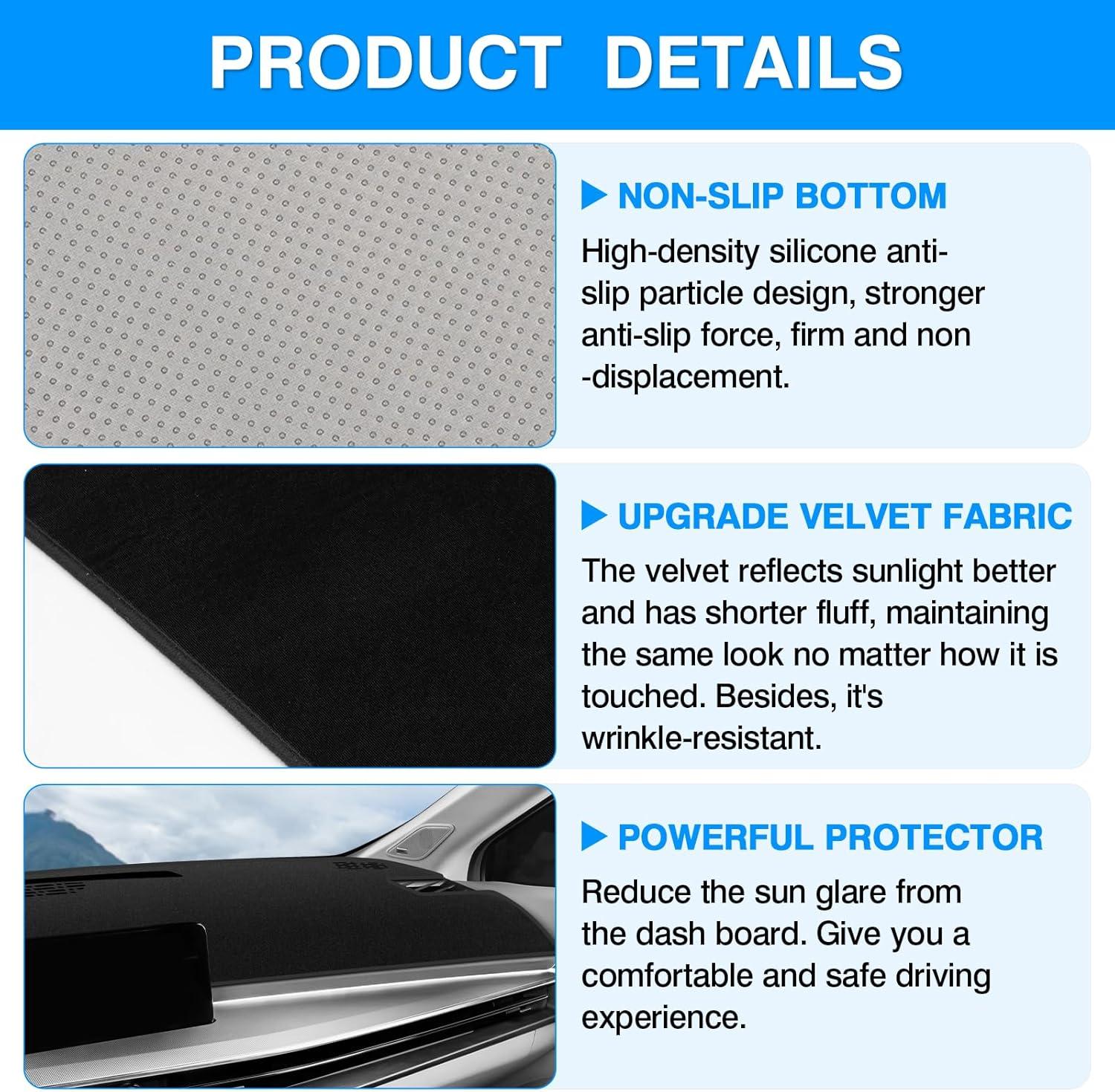 Premium Flannel: Our dash mat is made of high-quality flannel fabric, which is light and soft and resistant to distorting, fading, and wrinkles. The thick black fluff layer winter effectively absorbs heat, keeping the dash cooler in the summer and warmer in the winter