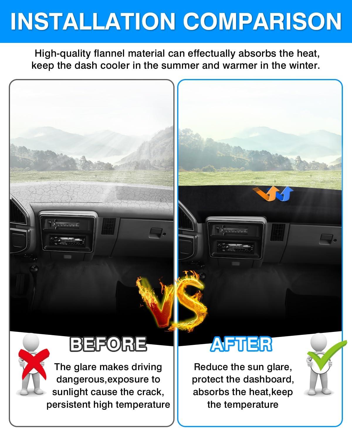 Premium Flannel: Our dash mat is made of high-quality flannel fabric, which is light and soft and resistant to distorting, fading, and wrinkles. The thick black fluff layer effectively absorbs heat, keeping the dash cooler in the summer and warmer in the winter.